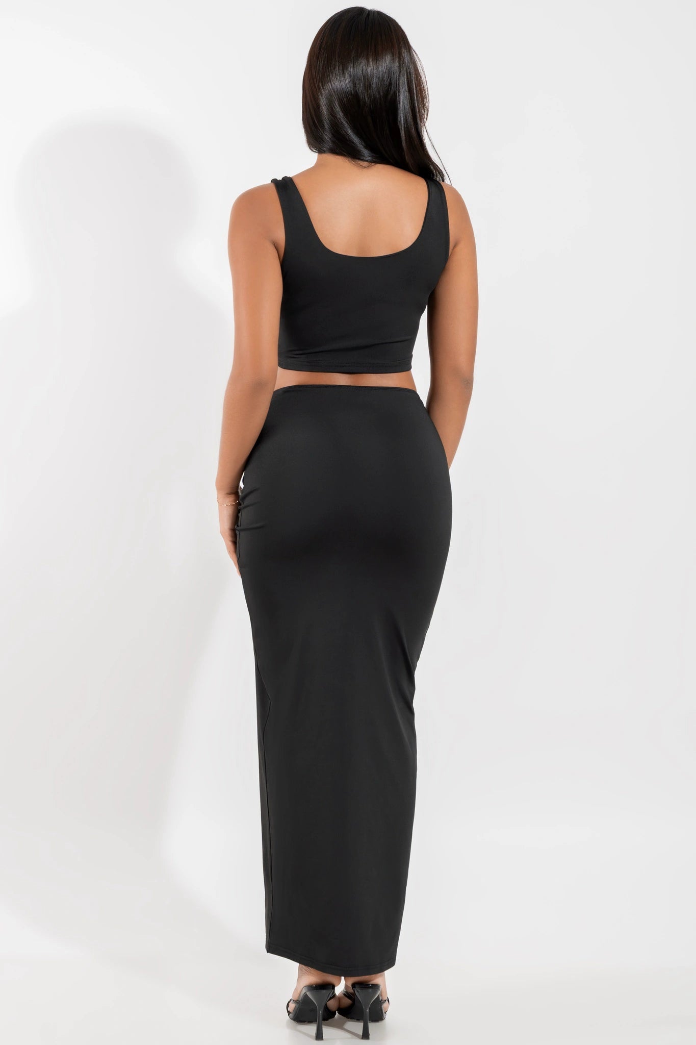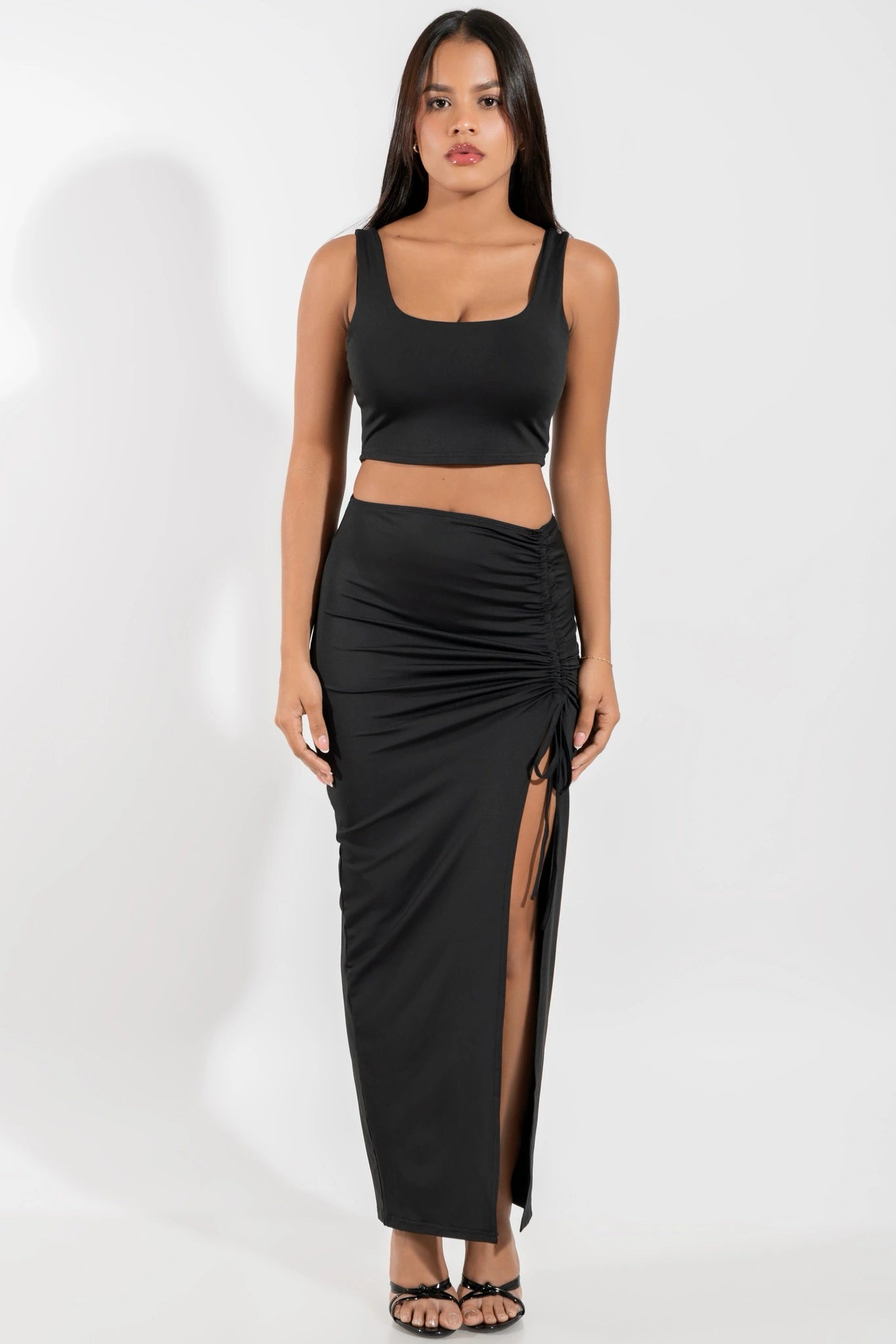 A fitted two-piece set with a clean crop top and a high-slit ruched skirt that highlights your waist and legs. Sleek, flattering and easy to wear, perfect for nights when you want an effortless, sculpted look.