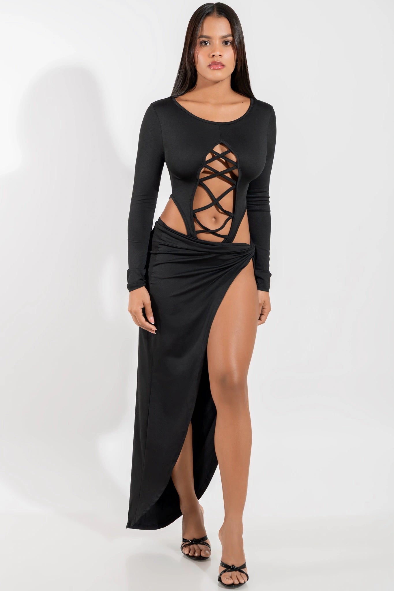 A statement two-piece set with a lace-up long-sleeve top and a high-slit skirt that shows off your waist and legs. Bold, fitted and perfect for nights when you want a sharp, confident look.