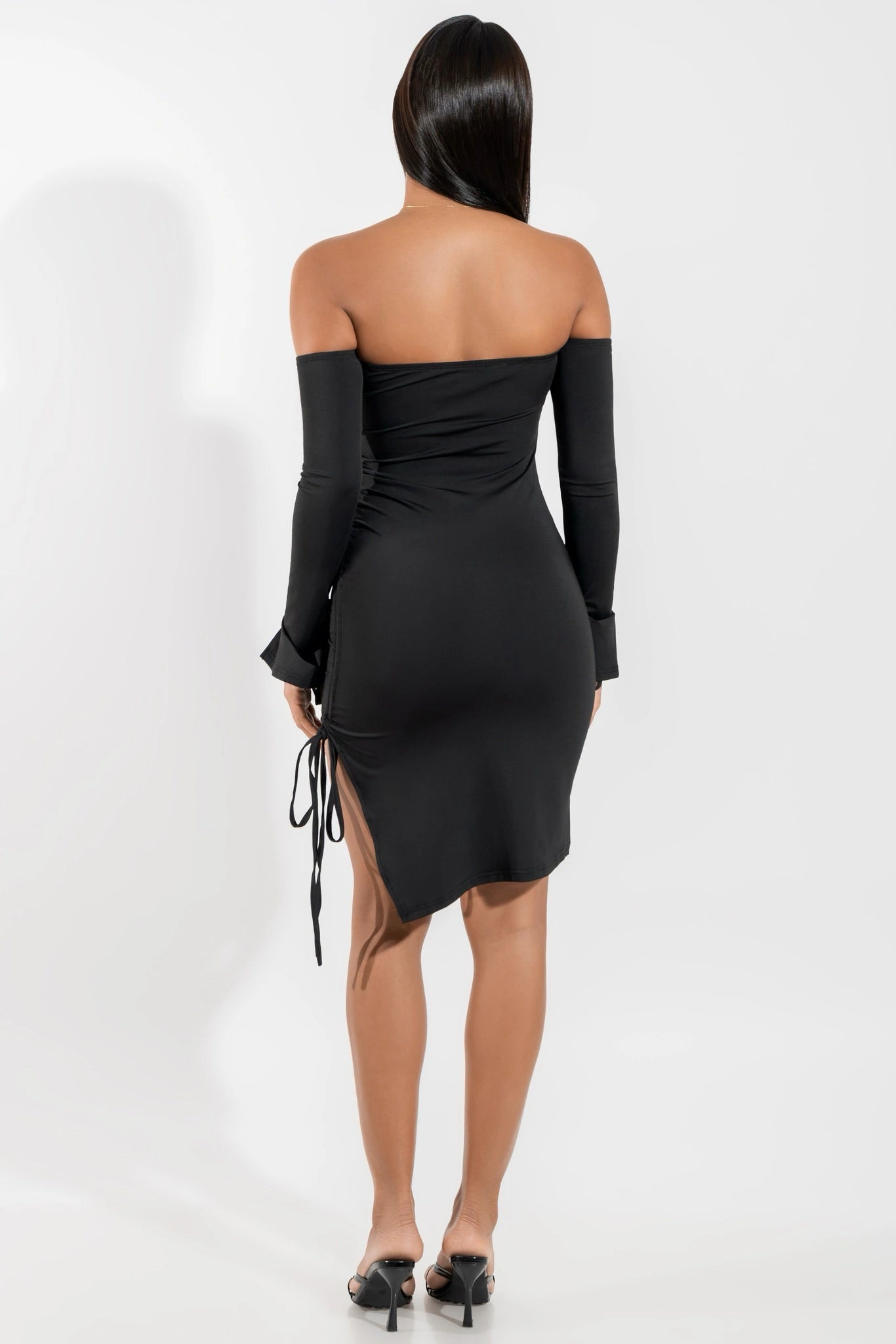 This off-shoulder mini dress shapes your body with a smooth, supportive fit and a clean neckline that shows off your shoulders. The side drawstring adds a sharp, confident touch while letting you adjust the length to suit your look. Sleek, flattering and perfect for nights when you want something bold that still shows your shape.